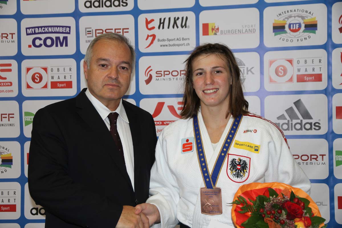 Im Kampf um Bronze wurde Michaela Polleres ihrer Favoritenrolle voll gerecht, verkniff sich diesmal auch jedwede Startschwierigkeiten und konnte im Bodenkampf einen Festhaltegriff ansetzen, der den Kampf nach 1:55 Minuten vorzeitig beendete. ÖJV-Präsident Hans-Paul Kutschera zeigte sich von der Leistung der 18-Jährigen beeindruckt: „Michaelas Erfolg ist alles andere als ein Zufallsprodukt, sie hat ja bereits in den letzten zwei Jahren groß aufgezeigt. Sie ist eigentlich schon in der Weltklasse angekommen, fügt sich nahtlos in unser vielversprechendes Damenteam ein. Sie ist auch Bestandteil unseres Projektes „Kader 2020“, der in den nächsten Jahren unser finanzieller Schwerpunkt sein wird.“